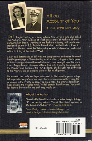 All on Account of You: A True WWII Love Story 1942. Angie Courtney is a spirited young woman realizing her dream. She is living in a girls’ club in New York City, studying fashion design. Bill Luddy, a boy she left behind in her hometown of Altoona, PA, is now a Ninety-day Wonder stationed on a Navy ship docked on the Hudson Bay. They begin dating each other again in 1942 during his officers' training and he wins her heart through his daily love letters.
